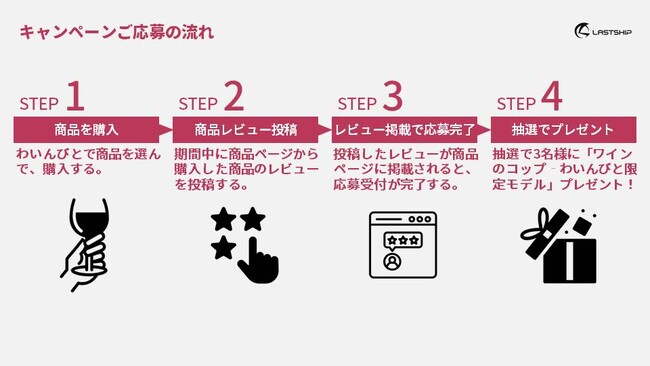 日本ワインの文化振興・販売促進事業を展開する株式会社LASTSHIP(本社:広島県広島市、代表取締役社長:山下武、以下、LASTSHIP)が運営する日本ワイン専門のモール型ECプラットフォーム「わいんびと」(以下、わいんびと)は、わいんびとユーザー登録者を対象に、商品レビュー投稿・掲載で「ワインのコップ - わいんびと限定モデル」をプレゼントするキャンペーン(以下、本キャンペーン)を実施します。
