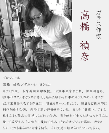 このワインのコップ。「質感マニア」という高橋氏が、型を使わない、重力と遠心力を巧みに操って成型する「宙吹き」という技法ならではの質感にこだわった作品です。工業製品にはない、見た目にもキレイでつるんとした気持ちのいい質感と上品なフォルムが特徴です。