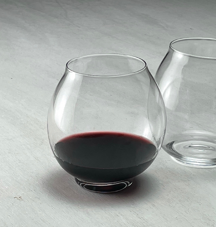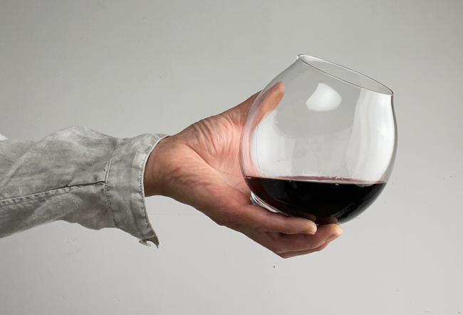 手からはみ出すほどの大ぶりなサイズながら軽いのでスワリングもスムーズ。また、和食器を思わせるような高台がついているため、手に吸い付くようなフィット感があります。リムの立ち上がりの形状を工夫し、口当たりの良さにもこだわりました。