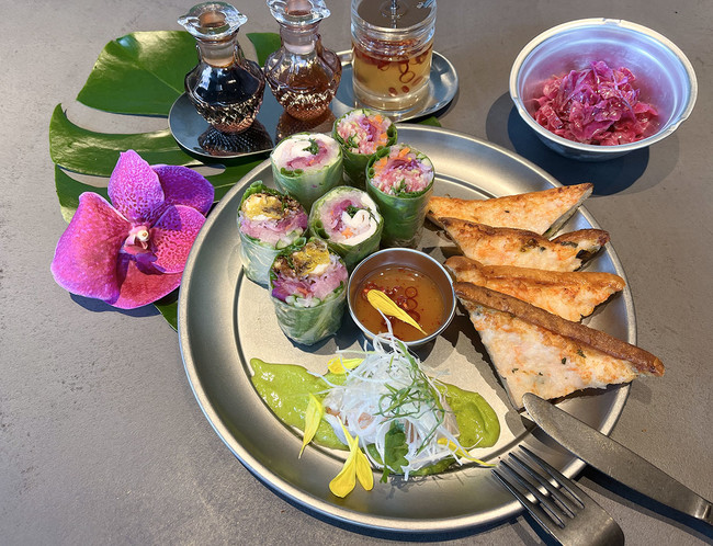 前菜には、アジア料理の定番でもある生春巻き(ソフトシェルクラブ、蒸し鶏、野菜の三種)と、香ばしい食感と海老の旨味が堪能できるトラピリカの人気メニュー海老トースト、新鮮な白姫海老を九条ネギと一緒にお召し上がりいただくカルパッチョをご用意しました。