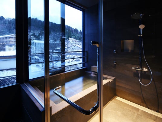 2023年リニューアル、温泉半露天風呂付き客室<かわみ>スタイリッシュツインから楽しむ雪見風呂【45平米/定員3名】