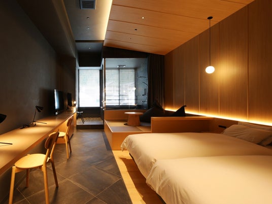 2023年リニューアル、温泉半露天風呂付き客室<かわみ>スタイリッシュツイン【45平米/定員3名】