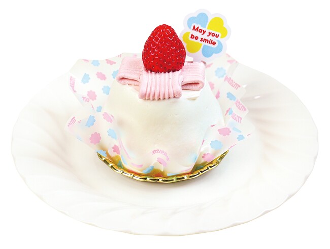 シフォン生地のスポンジに、軽いタイプのカスタードクリーム、苺をサンドし、ミルキークリームで包みました。家族の温かさを表現した“かまくら”をモチーフにしたケーキです。上面には苺クリームでリボンをかけ、贈り物のような見た目に仕上げました。メッセージ入りのペーパープレートを2種類ご用意しています。