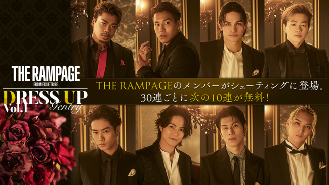 2022年8月31日(水)よりステップアップシューティング三代目 J SOUL BROTHERS【Dress UP Gentry】、THE RAMPAGE【Dress UP Gentry】Vol.1を開催中です。今回のシューティングは30連ごとに次の10連シューティングが無料になる特別な仕様となっております。