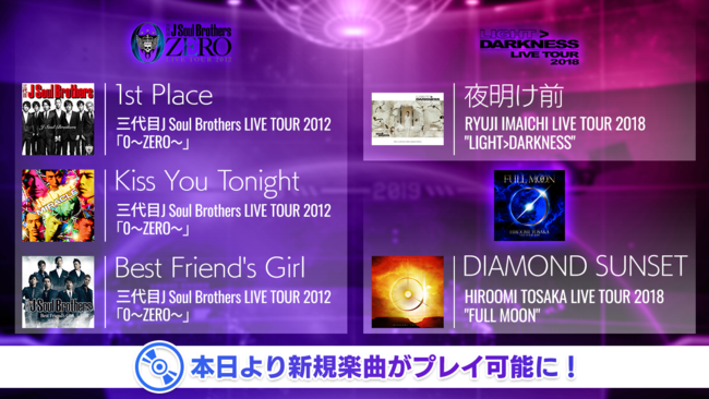 本日2022年9月1日(木) 15時から三代目 J Soul Brothers LIVE TOUR 2012「0~ZERO~」の楽曲が3曲、HIROOMI TOSAKA LIVE TOUR 2018 『FULL MOON』、RYUJI IMAICHI LIVE TOUR 2018 『LIGHT>DARKNESS』から各1曲がプレイ可能となっております。
