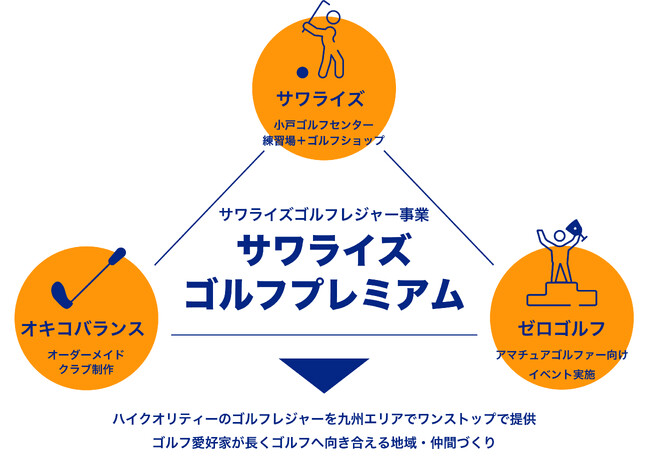 オキコバランス広島店のリニューアルオープンにより、サワライズ、オキコバランス、ゼロゴルフ株式会社の3社が連携して進めるゴルフレジャー総合事業「サワライズゴルフプレミアム」を推し進めます。