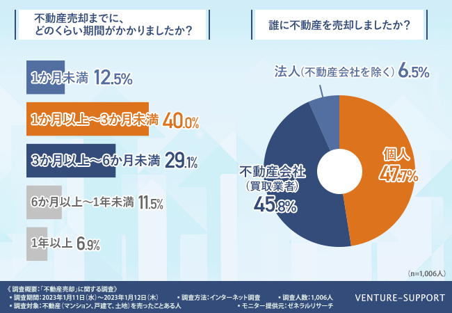 続いて、不動産売却までにかかった期間および売却先について調査。