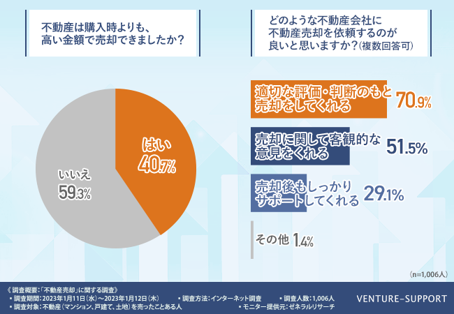 「不動産は購入時よりも、高い金額で売却できましたか?」と質問したところ、4割が「はい(40.7%)」と回答した。続いて、どのような不動産会社に不動産売却を依頼するのが良いと思うか聞いたところ、7割が「適切な評価・判断のもと売却をしてくれる(70.9%)」と回答した。