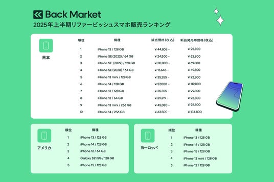 世界最大級のリファービッシュ電子機器に特化したマーケットプレイスであるBack Market Japan株式会社(本社:東京都渋谷区 以下、Back Market)は本日、2025年1月1日から2025年6月30日の間に、日本、米国、欧州(仏・英・独・西)のBack Marketで取り扱ったリファービッシュスマートフォンの販売台数における実績データをもとに、「2025年上半期リファービッシュスマホ販売数ランキング」を発表します。リファービッシュ品とは、中古品として回収された電子機器を専門家が検査・クリーニング・修理し、全ての機能で正常作動が確認されている整備済製品となります。