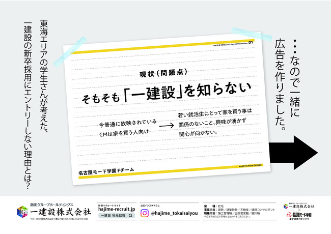 年間46,000戸以上の住宅を供給する飯田グループホールディングスの中核企業の一建設株式会社(本社:東京都豊島区、代表取締役:堀口 忠美、以下、一建設)は、専門学校 名古屋モード学園と2022年11月2日に実施した産学連携プロジェクト「新卒採用広告・クリエイティブデザインコンテスト2022」最終発表会にて、最優秀賞を受賞したチームが提案した広告を2023年5月29日(月)より名古屋市営地下鉄全線で掲出いたします。
