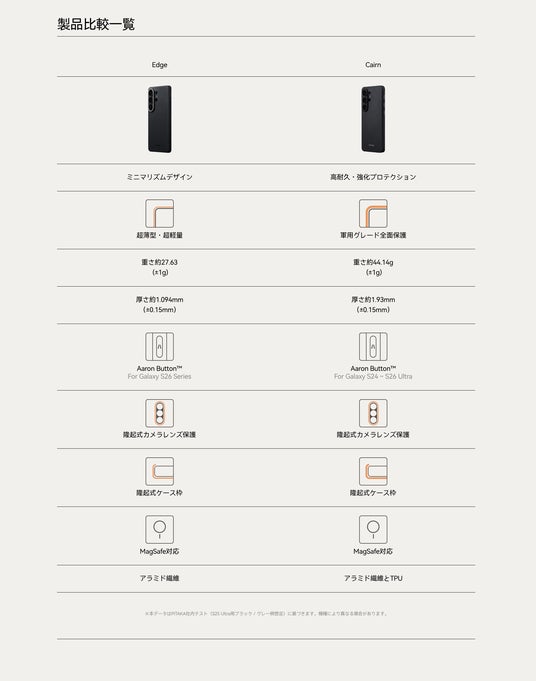 - 全モデル標準搭載: Galaxy S26シリーズ全対応ケース(Edge Case、Cairn Case)に、3個のAaron Button(TM)を標準搭載