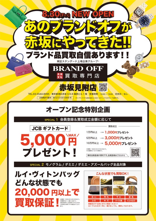 中古ブランド品のバッグ・時計・宝飾品などを扱うブランドリユースシェアNo.1(※)のコメ兵ホールディングスグループの一翼である株式会社K-ブランドオフ(石川県金沢市)は、東京都港区にFC37店舗目となる「ブランド買取専門店 BRAND OFF 赤坂見附店」をオープンいたします。 ※ 「リユース市場データブック2023」((株)リフォーム産業新聞社調べ)