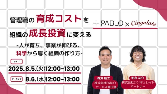 科学とデータの力で組織開発を支援する株式会社シンギュレイト(本社:東京都渋谷区、代表取締役:鹿内 学、以下シンギュレイト)は、株式会社PABLOと共催で『管理職の育成コストを組織の成長投資に変える -人が育ち、事業が伸びる、科学から導く組織の作り方-』を開催します。このセミナーは2025年8月5日(火)12:00~13:00でライブ配信、8月6日(水)12:00~13:00でアーカイブ配信されます。