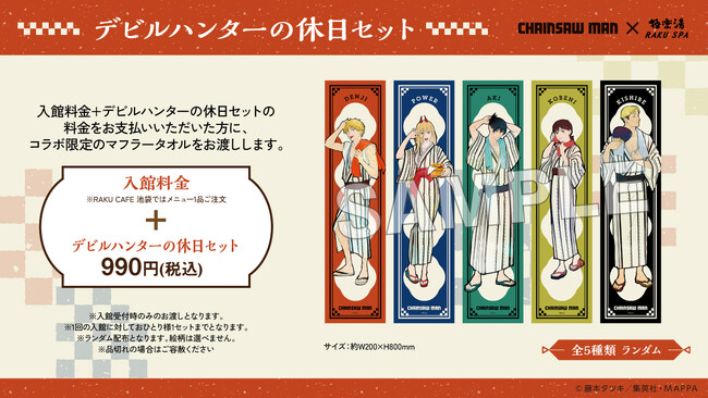店舗ご入館時に、入館料金+デビルハンターの休日セットの料金をご購入いただいた方に、描き下ろしイラストを使用したコラボ限定マフラータオルをランダムでお渡しします。