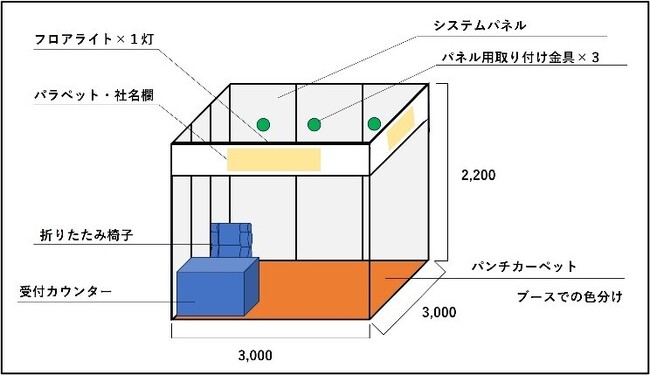 標準装備 :システムパネル、パラペット、社名板、床カーペット、受付カウンター、椅子、コンセント(100V 2口)、展示用パネル取り付け金具、無線LAN