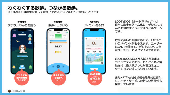 LehmanSoftが開発するLOOTaDOGは、日常の散歩をゲーム化し、Web3わんこ育成を楽しめるアプリです。アプリを活用し、ワンストップでペットライフを豊かにすることを目標としています。