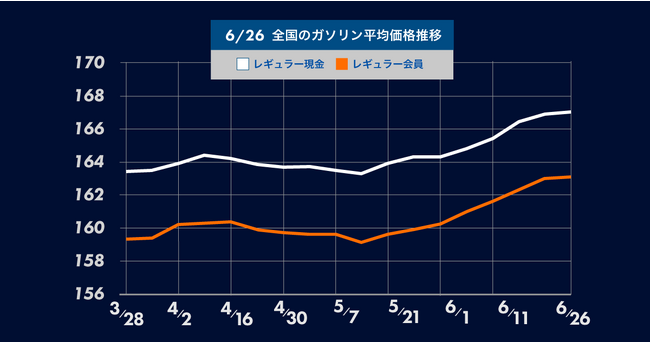 6月26日(月) 時点のレギュラーガソリンの全国平均は、167.0円となり先週から1.1円の値上がり。6週連続の値上がりとなりました。