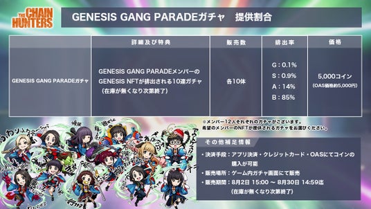 Web3ゲームやプラットフォーム事業を手掛ける株式会社Mint Town(本社:東京都千代田区、代表取締役CEO:國光 宏尚、以下、Mint Town)は、同社が企画・運営を行う新作Web3ゲーム『THE CHAIN HUNTERS(ザ・チェーンハンターズ)』は、初代アンバサダーに就任したGANG PARADEのメンバーのキャラNFTが獲得できるコラボガチャを開催しました。