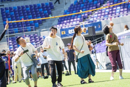 アンデルセングループ、パン食い競走協会の協力のもと、「パン食い競走@エディオンピースウイング広島」を開催しました。誰もが同時に楽しめる日本ならではのかけっこでスポーツができる平和を実感することを目的に開催。約150名が参加し、パンをくわえての全力疾走を楽しみました。