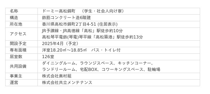 株式会社奥村組(本社:大阪市阿倍野区、代表取締役社長:奥村 太加典)は、社有地の有効活用事業で株式会社共立メンテナンス(本社:東京都千代田区、代表取締役社長:中村 幸治)と提携し、2025年4月に学生・社会人向けの寮『ドーミー高松錦町』をオープンします。