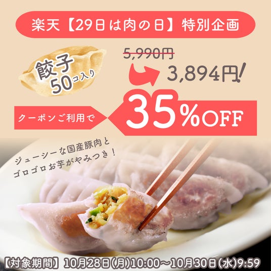 そんな芋國屋の次なる人気商品『おいもの餃子』が楽天市場肉の日イベントに向けて35%OFFのクーポンを発行いたします。