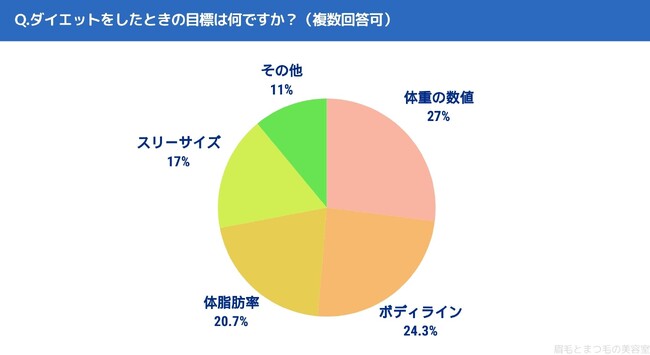 ダイエットをしたときの目標をお聞きしたところ「体重の数値(27%)」、「ボディライン(24.3%)」、「体脂肪率(20.7%)」、「スリーサイズ(17%)」、「その他(11%)」という結果になりました。