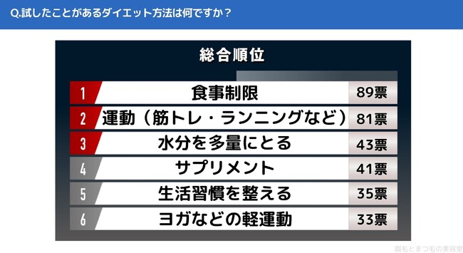 試したことがあるダイエット方法をお尋ねしたところ、「食事制限(89票)」、「運動(81票)」、「水分を多量にとる(43票)」、「サプリメント(41票)」、「生活習慣を整える(35票)」、「ヨガなどの軽運動(33票)」という結果になりました。