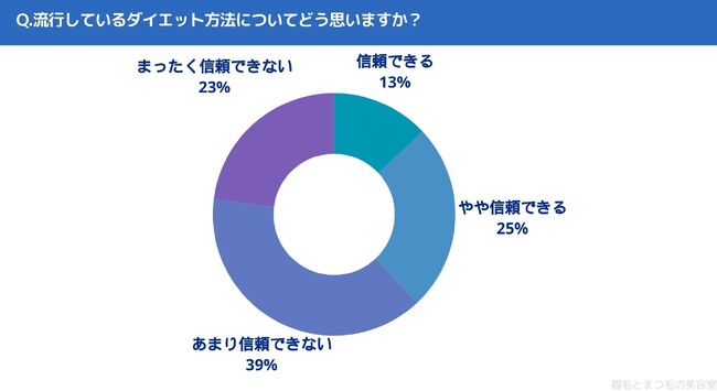 流行しているダイエット方法についてお尋ねしたところ「信頼できる(13%)」、「やや信頼できる(25%)」、「あまり信頼できない(39%)」、「まったく信頼できない(23%)」という結果になりました。