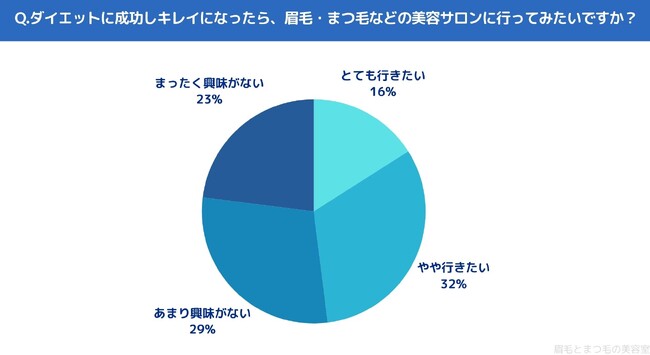 ダイエットに成功しキレイになったら、眉毛・まつ毛などの美容サロンに行ってみたいかお聞きしたところ「とても行きたい(16%)」、「やや行きたい(32%)」、「あまり興味がない(29%)」、「まったく興味がない(23%)」という結果になりました。