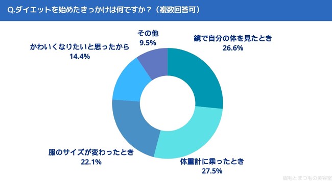 ダイエットを始めたきっかけをお聞きしたところ「鏡で自分の体を見たとき(26.6%)」、「体重計に乗ったとき(27.5%)」、「服のサイズが変わったとき(22.1%)」、「かわいくなりたいと思ったから(14.4%)」、「その他(9.5%)」という結果になりました。