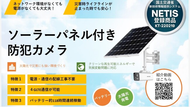 本モニタープランでは、選ばれた自治体に対して、HIKVISION製のソーラーパネル付き防犯カメラを6ヶ月間無償で提供します。このカメラは、設置の自由度が高く、電源のない場所でも利用可能です。夜間や暗所での高品質なカラー映像撮影機能を備えており、様々な用途に活用できます。