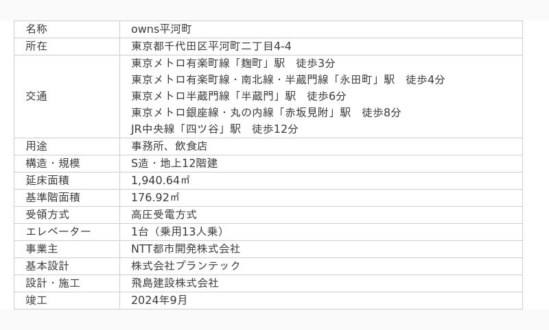 NTT都市開発株式会社(本社:東京都千代田区、代表取締役社長 池田 康、以下「当社」)は、千代田区平河町2丁目にて開発を進めておりました「owns平河町」(以下「本物件」)が竣工したことをお知らせします。