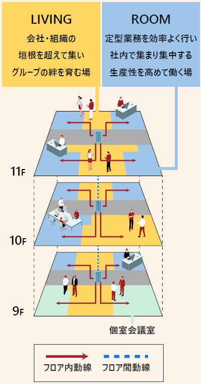 住宅の団らんの中心がリビングであるように、会社・組織の枠を超えてファミリーとして日常的に顔を合わせる「LIVING」を中心としたオフィス構成になっています。各社専用の執務エリアである「ROOM」に向かうには「LIVING」を通る動線とし、「LIVING」に社員がにじみ出てくるように「ROOM」の通常執務以外の機能は最小限とするなどの工夫がされています。