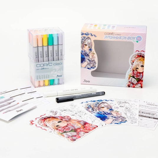 この度発売する「コピックチャオ スペシャルギフトBOX Flowers」は、人気のコピックチャオから人物キャラクターが描きやすいカラーを厳選した「コピックチャオ スタート24色セット」に加え、主線用に使えるドローイングペン「コピックマルチライナー(ブラック)」、仕上げに使える新製品の水性マーカー「コピック アクレア(スノーホワイト)」などが一式そろうスターターセットです。