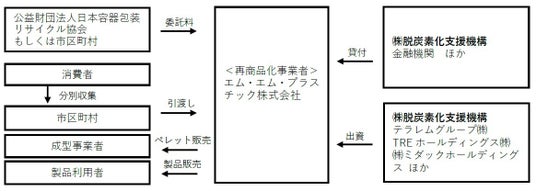 - 本事業は、容器包装リサイクル法(「容器包装に係る分別収集及び再商品化の促進等に関する法律」1995年制定)に基づき、一般家庭から排出されるプラスチック製容器包装やプラスチック製品などの廃棄プラスチックを地方自治体経由で回収し、再生プラスチックを使ったペレットや物流用パレットを製造・販売する事業です。