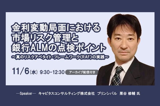 講師には、キャピタスコンサルティング株式会社 プリンシパル 栗谷 修輔 氏を迎え、金利変動局面におけるALM・リスク管理態勢の点検ポイントや「リスクアペタイト・フレームワーク(RAF)」の実践について解説していただきます。詳細は以下にてご確認ください。