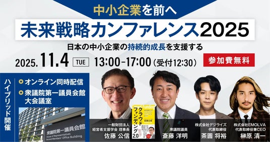 株式会社ダブルエム(所在地:名古屋市千種区、代表取締役:安井 勝)は、講演者選定・集客戦略・イベント運営を一括担当している「未来戦略カンファレンス2025」(2025年11月4日開催)に、新たに株式会社デジライズ 代表取締役の茶圓 将裕(ちゃえん まさひろ)氏が登壇することをお知らせいたします。本カンファレンスは、日本の中小企業の持続的成長と強靭化を目的としており、茶圓氏の登壇により、AIを活用した未来志向の経営戦略について、より具体的で実践的な議論が展開されることを期待しています。