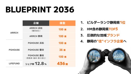 BLUEPRINT2036の概要。新築住宅事業を静岡県中部に展開して年間436棟を実現し、圧倒的な地域ブランドを確立する。