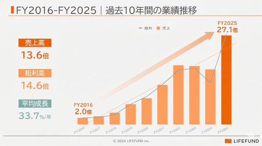 LIFEFUNDは業界が縮み続けた10年間で売上高を13.1倍、粗利高を14.6倍に伸ばした。年平均成長率33.1%。FY2025単年では売上高27.1億円(前期比1.6倍)、経常利益1.36億円、社員62人(前期比1.5倍)。倒産・廃業が相次ぐ業界のど真ん中で、この会社は成長し続けている。