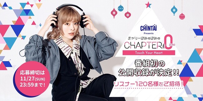 お部屋探しのリーディングカンパニー株式会社CHINTAI(本社:東京都港区 代表取締役会長兼社長 佐藤茂以下 CHINTAI )が番組提供を行っている 、TOKYO FM 『 CHINTAI presents きゃりーぱみゅぱみゅ Chapter #0~Touch Your Heart ~』(毎週日曜 12:30-12:55 放送)では、2022年12月6日(火)、TOKYO FM ホール(東京都千代田区)にて、番組初となる公開収録の実施が決定いたしました。公開収録には、リスナー120名様を無料でご招待いたします。