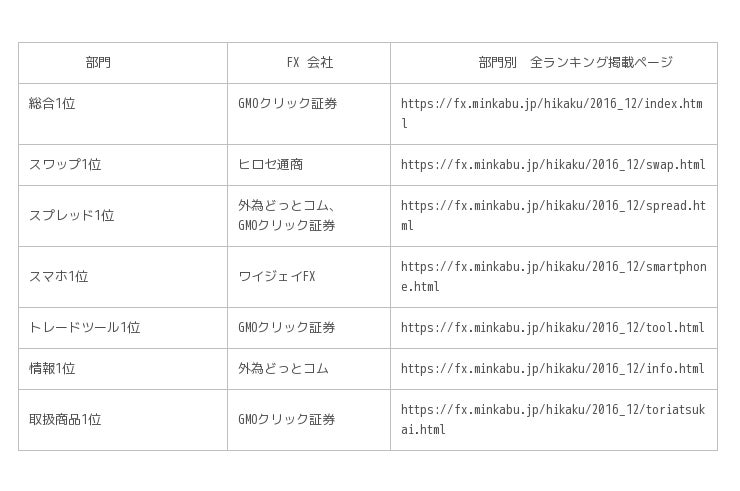 株式会社みんかぶ(本社:東京都千代田区、代表取締役:瓜生憲、以下「当社」)は、運営する『みんなの株式』(http://minkabu.jp/)に掲載しているネット証券比較と、同じく運営する『みんなの外為』(http://fx.minkabu.jp/)に掲載しているFX会社比較の2016年/年間ランキングを発表いたしました。