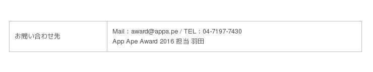 App Ape Award 2016 授賞式では、報道関係者様のご出席も受け付けております。授賞式当日は、ノミネートアプリの開発企業様をお招きし、「アプリ・オブ・ザ・イヤー2016」受賞アプリの発表及び、賞の贈与などを行うセレモニーと、懇親会を行います。受賞アプリの開発企業様へのご取材も可能でございますので、是非ともご出席ください。ご出席をご希望の方は、下記のお問い合わせ先へご連絡ください。