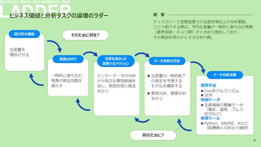 - ビジネス課題から導かれる価値と、それに対応する分析タスクのつながりを段階的に示す「論理のラダー」を掲載