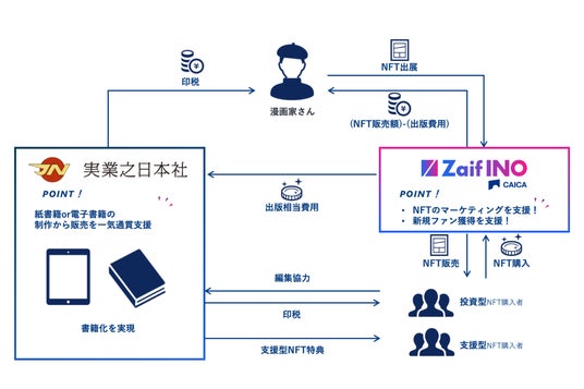 このプロジェクトでは、実業之日本社とZaif INOが協力し、漫画家さんの創作活動を全面的にサポートします。Zaif INOがプロモーションや資金配分、NFT購入者とのコミュニケーションを担当することで、漫画家さんが作品制作に専念できる環境を整え、プロジェクト全体の成功を支えます。