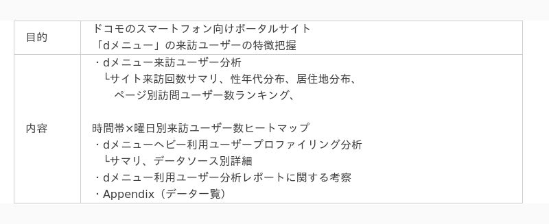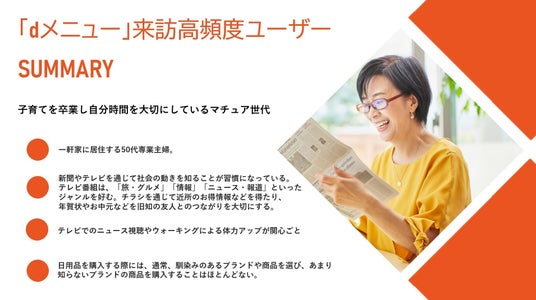 本レポートは、「dメニュー来訪ユーザー分析」、「dメニューユーザープロファイリング」、「考察」の3つのパートで構成されております。また、最新の媒体基本情報だけではなく、ユーザー契約情報、キャリア決済データ、位置情報データ(Wi-Fi)、アプリ利用ログ、dポイント加盟店利用情報、アンケートデータなど、ユーザーのリアルなデータを抽出し分析することで、今後のより効果的な広告出稿のヒントとなる考察情報も掲載しています。