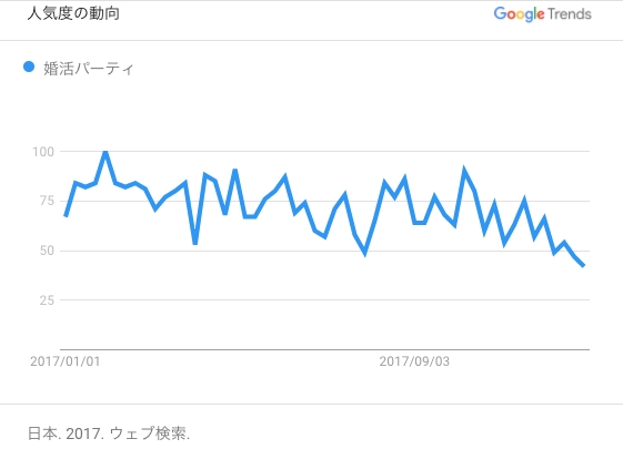 婚活パーティ事業全体としては、市場は引き続き伸長していると考えられます。Google Trendで目に見える推移が無かったことについては、「婚活パーティ」という言葉自体がすでに広く浸透し尽している、ことが示唆されます。