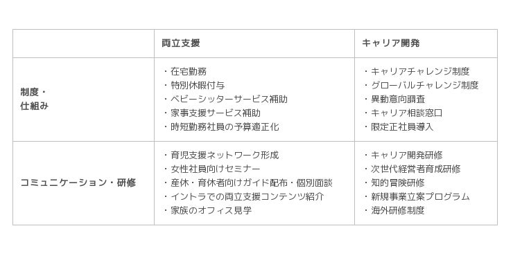 よう、両立支援やキャリア開発などに取り組んでまいりました。結果、育児休業からの復帰