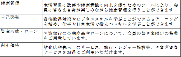 企業の管理者さまと従業員さま双方にご利用いただけるコンテンツを取り揃えております。阿波銀行の金融商品と福利厚生代行事業者であるイーウェルの福利厚生サービスや健康サービスといった両者の強みを併せ持ち、人材の採用・定着や健康支援などの面から企業をサポートすることを目的としております。