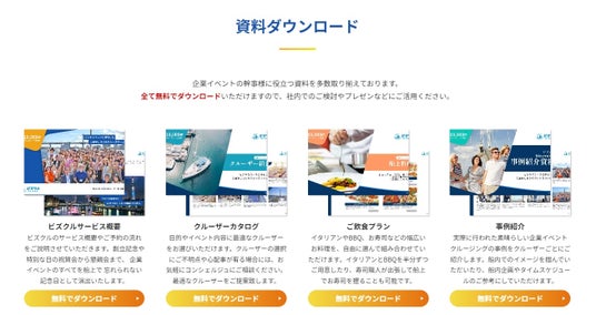 ビズクル最大の特徴の一つとして、無料でダウントードできる資料を豊富に取り揃えています。種類豊富な船舶や乗船場所、船内コンテンツ(オプション)などを写真付きで分かりやすくまとめています。幹事が検討の際に使用できるだけでなく、そのままプレゼンテーションの資料として社内提案を行いやすい環境を整えています。
