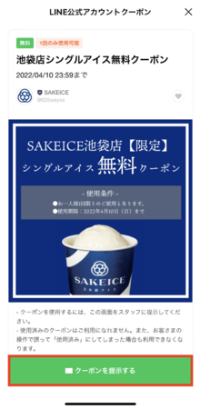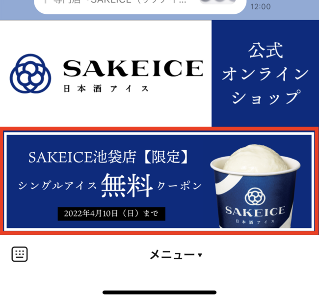 2)友だち追加後、トーク画面下部にリッチメニューが表示されます。その中にある「SAKEICE池袋店【限定】シングルアイス無料クーポン」部分をクリックして表示してください。